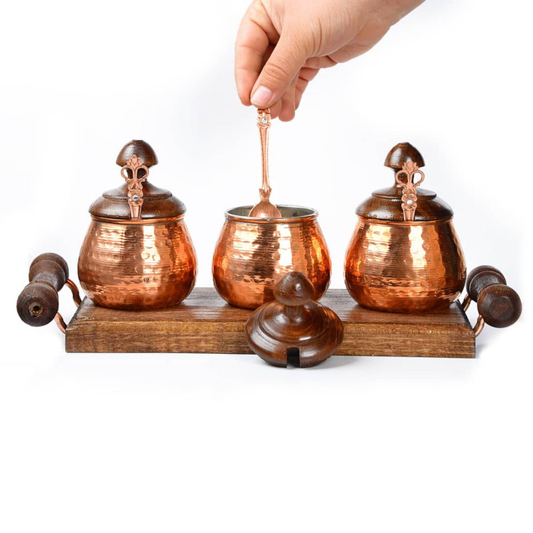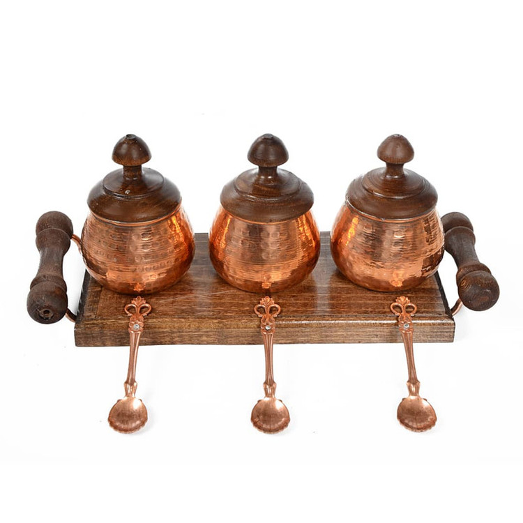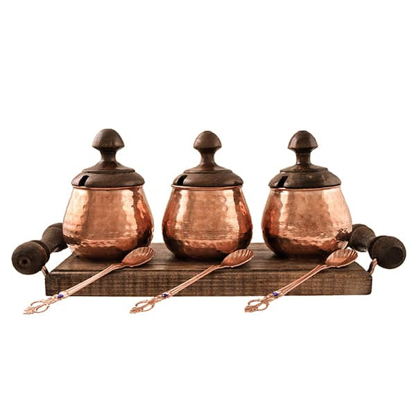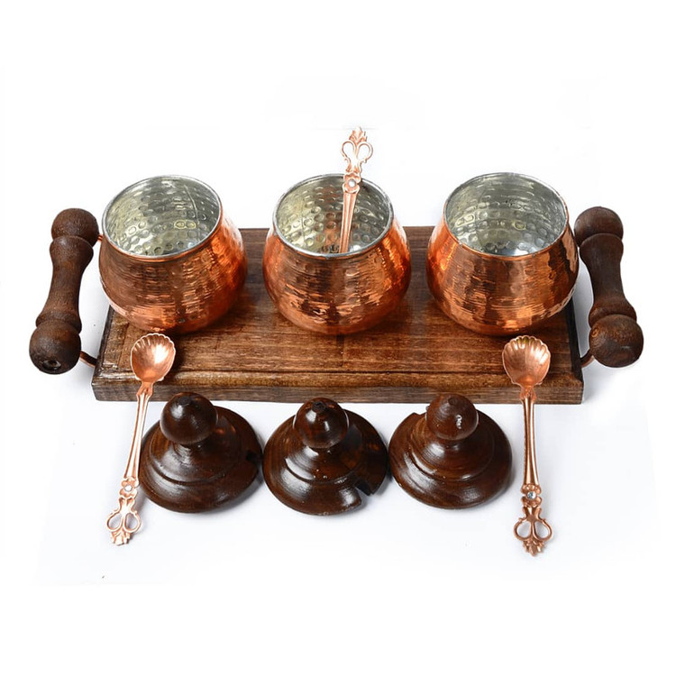 تولید شده با ورق مس خالص با ضخامت بالا جهت انواع مصارف 3 عدد ظرف به همراه 3 عدد قاشق نگین دار زیبا دارای سینی چوبی دسته دار بدنه چکش کاری شده