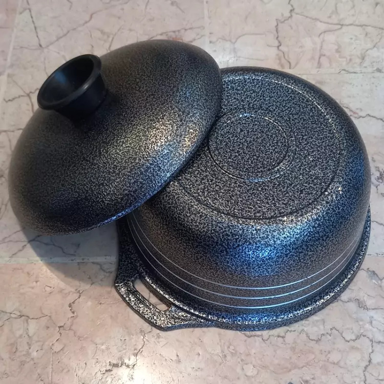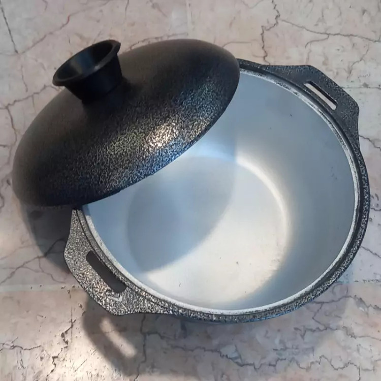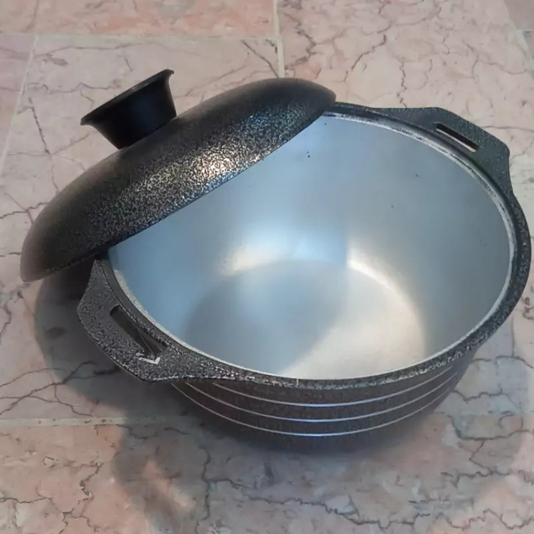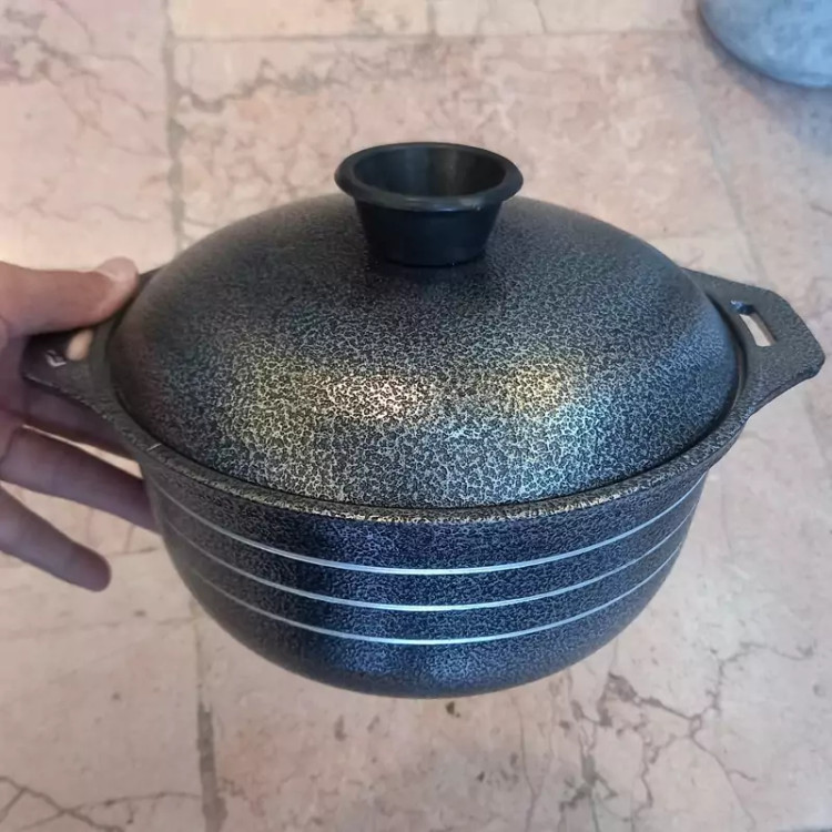قابلمه چدن روسی ۴نفره بدنه بیرون روکش گرانیتی شده بسیار زیبا داخل فاقد هرگونه روکش و بصورت طبیعی و بدون عوارض و ضرر کیفیت بسیار خوب و جنس چدن آلومینیومی